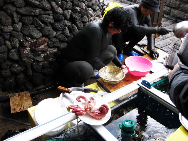 海女是指不需任何特別潛水裝備,即可潛入海中捕獲各類海鮮的女性 (海螺.海膽.魚.章魚...等)